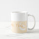 Customisable white mug with a salmon-coloured decorative band (Thank You is not customisable). You can easily add and change text (font, size, colour and position) by clicking the customise button. Other models are available.