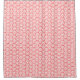 This shower curtain has an Art Deco design of salmon curved lines in a triangle shape on a field of white repeated across the design.
