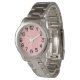 This women's watch has an Art Deco design of salmon curved lines in a triangle shape on a field of white repeated across the design.