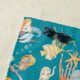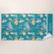 Two cute mermaid images are repeated in the pattern on this beach towel, along with an octopus, fish, a scuba diving dog, and more! Light blue text says "Salty & Sweet". The colourful images are placed on an ocean blue background. A matching border at the bottom holds your name in white script. Fun!