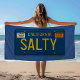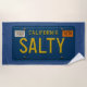 Travel back in time to the year 1969 with this fun retro-inspired California license plate design. Bold embossed-look yellow text with the custom tag number "SALTY" pops on the blue contrast. The vintage style lettering, tag stickers and panhead screws bring a nostalgic vibe. This indigo blue towel is perfect for your next surf session, beach day or pool party. Stay salty!