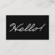 "Hello!" in simple script, against black background. Simple and elegant black and white business card for business or personal use.