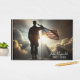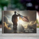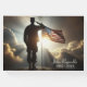 A silhouette of a soldier saluting an American flag with a dramatic sunset in the background for a funeral or memorial service.