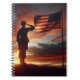A silhouette of a soldier saluting an American flag with a dramatic sunset in the background.