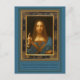 Salvator Mundi by Leonardo da Vinci circa 1500 Postcard ... Leonardo's traditional vision of Christ appearing out of the darkness as the Saviour of the World. Oil and lapis lazuli on walnut panel. This is the art work that broke all sales records at auction in November 15, 2017 for unbelievable $450.3 million! Discovered in near absolute ruin with heavy over-painting and being over 500 years old, it was known to be from Leonardo's workshop, though then thought to had been mostly by his workshop apprentice boys ... but, then was cleaned and dramatically restored and discovered to be much by Leonardo's own hand. Leonardo's workshop was known to have had produced a number of traditional Salvator Mundi oil on wood panels. Leonardo's workshop apprentice boys transferred his drawings onto prepared white coated wood panels by poking holes along the drawn lines. This art work shows Leonardo's famed soft hazy sfumato style. Leonardo is known to have used his own hands to blend paint to soften line edges. Palm prints are seen on this painting. The details reflect the preparatory sketches found in his journals, especially the complex geometric design of the leather strapping. The hands and mouth also reflect Leonardo's preparatory sketches as well as his other known paintings. The robe paint consists of rare imported lapis lazuli that then was more expensive than gold that only Leonardo's wealthy patrons could afford ... the patron believed here to be the king of France. The painting passed from the kings of France to the kings of England by marriage of a French princess to an English king. Leonardo da Vinci was given a home in his final years by a king of France ... the home being connected by tunnel to the king's palace so that the king could visit and check on Leonardo da Vinci. Leonardo lived there with one of his workshop apprentices and young companion the Count Francesco Melzi who though of noble birth devoted his life to caring for Leonardo and to preserving Leonardo's journals some which are now in possession of the collection of the Queen of England. Lapis Lazuli is a blue mineral stone imported then, as now, from the area now called Afghanistan. It is the same rare stone used in the ancient Egyptian pure gold burial mask of boy Pharaoh King Tutankhamun for the dark blue eye liner and brows (the matching colour stripes of the Nemes headdress are of Ancient Egyptian glass). Lapis Lazuli blue oil paint was also used in the blue robe of the Virgin Mary by Renaissance painters for their wealthier patrons. Salvator Mundi paintings traditionally were frontal portraits with Christ's right hand raised in the Blessing and Christ's left hand holding a globe representing the World (or, alternately, the Heavenly crystal sphere believed to contain the World). Leonardo chose to not paint in a golden halo, wanting Christ to seem to appear as a vision out of the darkness. The face is softly painted. The nearer Blessing hand is more defined as Leonardo tried for a more three dimensional quality through atmospheric effects as he was renown for. Leonardo was left-handed and gay, artistic, and scientific minded. He studied light and shadow and atmospheric effects, human proportion, and the geometric proportion then called the Divine Proportion we call the Golden Proportion or Golden Ratio. He illustrated his friend Luca Pacioli's book De Divina Proportione. Please like, share, buy. I have put this extraordinary image onto metal and acrylic and wood panel wall hangings, fabric wall tapestries, note cards, postcards, standard greeting cards, big cards (8.5 inch by 11 inch that you can frame in standard document frames), stickers, lamps, soft comforting fleece blankets, pillows, clip boards, melamine plates, ceramic mugs, ceramic ornaments, and other items all which will make fine gifts or additions to your home. retirement home, church, church school, convent, monastery, funeral home, or memorial. Thank You So Much for liking, sharing, following, buying. Please use the Zazzle daily promo code to save money. Buy Zazzle Black for only about ten bucks a year for free delivery of unlimited purchases all year. See Zazzle for details. All products are quality made and guaranteed. You and your family and your friends will love these gifts. Click image then find and click the + plus symbol to enlarge to see the beautiful detail. Then you can enlarge further with your fingers to spread out the image if you have touch screen.