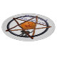 A pumpkin and a black cat perch on a reddish-orange chord pentacle to wish everyone a Happy Samhain.