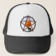 A pumpkin and a black cat perch on a reddish-orange chord pentacle to wish everyone a Happy Samhain.