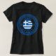 Samos, Greece women's black T-shirt featuring the National Flag Of Greece inside an Ancient Greek pattern circle symbol. Enjoy wearing this T-shirt while you're on vacation on the beautiful Samos island or give it as a gift souvenir.