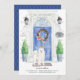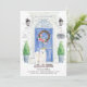 Announce your new address with our stylish announcement featuring a Samoyed, blue front door, welcome mat, slate sign, topiaries and a floral wreath set on a grey brick background.