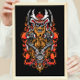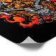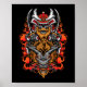 This design is of a samurai skull warrior and dragon. His face partially obscured by a helmet, surrounded by a fiery dragon's head. The samurai is holding two katanas. There is fire coming out of the dragons mouth, giving its a menacing vibe.