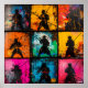 This powerful collection of black samurai silhouettes set against vibrant, graffiti-style backgrounds captures the dynamic energy of ancient warriors fused with modern street art. Each samurai is depicted in motion, wielding katanas, with bold and chaotic brushstrokes that evoke a sense of movement and action. The high-contrast between the dark silhouettes and vivid backgrounds makes this piece a striking addition to any space. Ideal for fans of samurai culture and contemporary urban art, this collection adds a fierce and dynamic element to your decor.