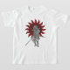 100% cotton so perfect for summer, It is a nicely designed t-shirt, the fabric is soft and the seams finished well, the body of the t shirt has no side seams. I bought a medium size for my two grandsons, aged 9 and 8 it will be slightly big on them but I would rather that than too small