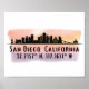 Art print features San Diego California city skyline silhouette with watercolor splash and latitude & longitude map coordinates