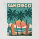 A vibrant vector illustration depicting a quintessential San Diego beach scene, with surfboards propped in the sand, tall palm trees swaying, and a large setting sun over the ocean. The words "SAN DIEGO" are prominently displayed, capturing the city's laid-back, surf-centric atmosphere.