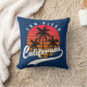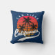 San Diego throw pillow with a retro design that features a sunset and palm trees on Old Glory Blue and Red on the reverse side. This throw pillow design also has California in a handwritten font with a swash tail glyph for that stylish retro look.
