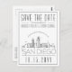 A unique wedding save-the-date postcard for a marriage taking place in the beautiful and historic city of San Diego. This invitation features a stylised illustration of the city's unique skyline with its name underneath. This is followed by your wedding day information in a matching open lined style. On the reverse side of the post is your address information. All individual elements of the invite card are unlocked so feel free to change any details necessary such as font sizes, styles and more by using the customisation function. You can add a photo to the reverse side and add a black and white filter to it. Have fun being creative and making it your own!