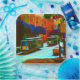 Colourful graphic of a street scene at San Francisco with cable cars...