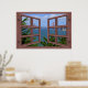 This design features a faux red wooden frame 6 pane window opening to a spectacular view of the San Francisco Bay.