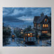 Experience the charm of San Francisco at twilight with this moody poster. Two cable cars glide down a rain-slicked street, flanked by Victorian houses with glowing windows, while Alcatraz looms across the bay under dramatic clouds. Ideal for urban art lovers, cityscape enthusiasts, and as a unique home decor or gift.