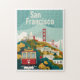 Capture the iconic charm of San Francisco California with this vintage travel poster-style image. A classic red cable car gracefully travels the city's streets, offering a glimpse of the bustling city. In the background, the majestic Golden Gate Bridge stands tall against the backdrop of a sunny day, adding a touch of timeless beauty to the scene. Whether you're a fan of vintage travel aesthetics or simply drawn to the allure of San Francisco's landmarks, this artwork is sure to evoke a sense of nostalgia and wanderlust. This vintage design will bring back memories of classic travel posters from a bygone era.