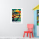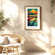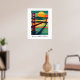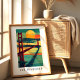 Vibrant sunset art print of San Francisco's Golden Gate Bridge with bold colors, calm waters, and a dramatic sun over the horizon.