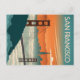 A captivating vector illustration showcasing the iconic Golden Gate Bridge emerging from a soft layer of fog, with the San Francisco skyline silhouetted against a gradient orange and blue sky. The words "SAN FRANCISCO" are prominently displayed at the top, evoking a classic travel poster aesthetic.