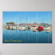 A panoramic view of a marina filled with sailboats, their white hulls and colourful sails reflecting in the calm, blue water. The masts of the boats create a geometric pattern against the clear, blue sky. In the distance, the Golden Gate Bridge with red towers can be seen, adding a touch of urbanity to the scene. The overall mood is serene and tranquil, capturing the beauty of a peaceful harbour.
