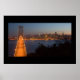 The beautifully illuminated San Francisco Bay Bridge and San Francisco city skyline at dawn. Traffic trails from cars are visible on the bridge.