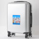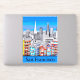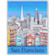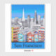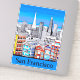 Sticker in an illustration of the city of San Francisco, in bright primary colours paired with black and white line art