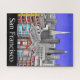 Puzzle in an illustration of the city of San Francisco, in bright primary colours paired with black and white line art