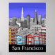 Poster in an illustration of the city of San Francisco, in bright primary colours paired with black and white line art