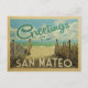 This Greetings From San Mateo vintage postcard design features a sandy beach with a beautiful turquoise ocean water and above the sea, a blue sky with billowy white clouds. In vintage travels style.