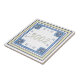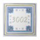 A hand drawn sand and blue frame around a house number with dark blue outlines and a pattern in the corners.