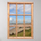 Make every day a day at the beach with this window scene of a wide sandy shoreline. Grass and rocks in the foreground lead the eye to an expanse of golden sand below. Waves gently lap at the edges of the beach. The sky is blue with white clouds. A wonderful way to create your own room with a view, this illusion window-effect poster lets you look out on golden sand no matter where you are.