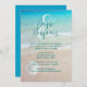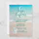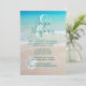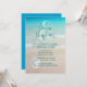 Sand dollar on the beach, wedding invitation with first names of the couple at the top. A large ampersand holds the names with a calm beach scene as the background. A single white sand dollar at the bottom with blue text for all invitation information. If needed, include reception address and reply information.
