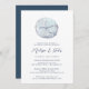 Our elegant summer wedding rehearsal dinner invitations feature classic nautical styling with a clean, minimalist look and a lighthearted touch of marine life. Design features a single pale blue watercolor sand dollar at the top, with your ceremony rehearsal and dinner details beneath in a chic combo of serif and sans serif lettering. Perfect for nautical or summer rehearsal dinners. Invitations reverse to hand drawn wavy stripes in tone on tone harbour blue.