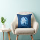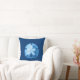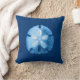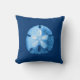 Throw pillow in a vintage sea life illustration of a sand dollar, digitally enhanced and colored in shades of blue and white, against a deep indigo blue background