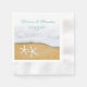 Two starfish and beach sand custom wedding napkins. Beach wedding shower or reception paper napkins with a place for names of the bride and groom and date of marriage. White foam on the sand is the background image for blue-green script text.