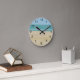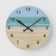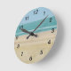 Painting of a beach scene of a turquoise ocean, tan sand, blue sky, and gentle white waves is printed on custom wall clocks, with large black numbers. Thank you for shopping at CherylsArt on Zazzle.