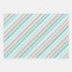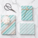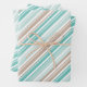 A classic candy cane stripe wrapping paper featuring a sand and sea colour scheme of a sandy tan, a tropical sea blue and a sea foam green with white candy cane stripe.