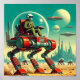 Retro-futuristic digital illustration featuring a humanoid figure in a green spacesuit with a helmet, seated in a spherical cockpit atop a red and silver robotic walker with four legs. The walker is traversing a desert-like landscape with a futuristic cityscape in the background, characterized by tall, sleek skyscrapers.