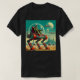 Retro-futuristic digital illustration featuring a humanoid figure in a green spacesuit with a helmet, seated in a spherical cockpit atop a red and silver robotic walker with four legs. The walker is traversing a desert-like landscape with a futuristic cityscape in the background, characterized by tall, sleek skyscrapers.