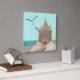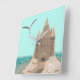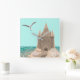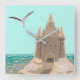A seagull hovers over a sandcastle by the sea with sea shells on sea-foam green background!!