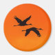 3" round magnet with image of two Sandhill Cranes flying into an orange sunset