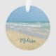 Beautiful beach ornament with gorgeous seaside photography featuring a pretty sandpiper standing at the edge of the ocean waves on a sunny summer day. Lovely blue green water waves roll onto the sandy shore where your name is personalised in cute teal typography. A beautiful Christmas gift for a daughter, mum, grandmother, or granddaughter.