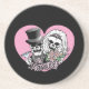 Bride and groom skulls are dressed in their wedding finest with JUST MARRIED text.