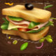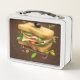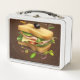 A white metal lunchbox with a black handle and a latch is displayed against a plain white background. The front of the lunchbox features a graphic of a sandwich on a wood-grain background. The sandwich is made with toasted bread, ham, cheese, tomato, spinach, and a black olive on top. There are also some green olives and a slice of red onion scattered around the sandwich. The wood-grain background has some white dots and dashed lines on it