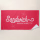 This beach towel features the text Sandwich, Massachusetts in a white nautical font with starfish accents. The background is a a brigth pink colour, but can be changed to any colour of your choice. Perfect for beachy, coastal or nautical theme decor.