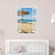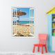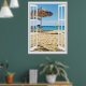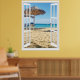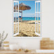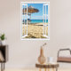 Beautiful tropical coastal beach scene window view with sandy beach, turquoise sea and blue sky. Picture of ocean beach view through window on custom poster print.