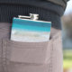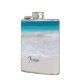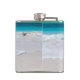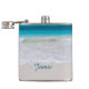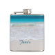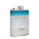 Beach themed drinking flask, with a photograph of a white sandy beach and aqua blue water. Personalise the blue text for yourself or as a great gift idea for your bridesmaids and groomsmen.